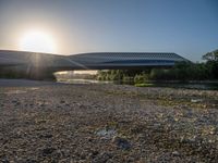 A modern bridge in Zaragoza, Spain, overlooking a river and an open space. The dawn sun is visible, casting a beautiful sunrise over the city. The architecture and urban environment create a picturesque scene.