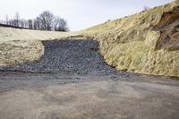 A pile of rocks lying on the side of a road in Bristol, Tennessee. The grey sky and open space accentuate the rugged beauty of the surrounding landscape. Construction equipment hints at ongoing quarry work.