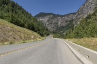 A road surrounded by stunning Canadian landscape in British Columbia. The asphalt thoroughfare winds through mountains and forests, with clear skies above. Guard rails and Armco barriers protect against the highland terrain.