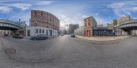 A bustling intersection in Brooklyn, New York captured by a 360-vision camera. Traffic flows under street bridges while classic architecture and vibrant street art blend seamlessly in this urban landscape.