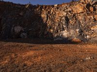 A beautiful brown horse stands at the base of a cliff in Shangri-La, China. It grazes near a fence that leads up to the rugged mountain landscape. The open space, day sunlight, and Mars-like rock formations create a breathtaking view. The horse enjoys the peacefulness of nature in this off-road track surrounded by trees and wild leaves. The rocky bedrock and gravel surface add to the unique geology of the area, resembling a stone wall. This image captures the essence of the wilderness and beauty of Yunnan, a region in Asia known for its stunning landscapes.