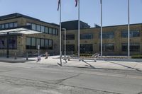 A modern office building in Toronto's business district. The brownstone facade, brick and stone elements add character to the urban design. Clear skies illuminate the neighborhood's public spaces, surrounded by vegetation.
