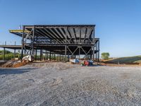 Sunny day at a construction site in the USA. Open space with dirt and gravel surfaces. Steel tracks and equipment hint at ongoing work. Clear sky provides a picturesque backdrop to the office building under construction.
