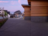 A view of a straight road lined with buildings and vegetation. The road surface is asphalt and the surrounding area is a residential neighborhood. The image captures the dawn sky and the shade provided by the surrounding trees.