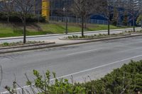 a bus stop on a city street next to a row of bushes and bushes at one end of the road