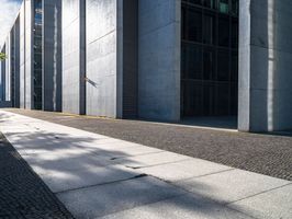 A black-and-white photo captures the modern architecture of Berlin's financial district. The building's profile stands out against a clear sky, while sunlight casts shadows on the concrete surface. A glimpse of urban design in Europe's business hub.