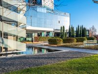 This is an image of a modern office building in the business district of Barcelona, Spain. The clear sky above highlights the low-rise architecture and urban design of the city. The grass surface in the foreground adds a touch of nature to the urban landscape. This photo represents a typical day in Barcelona, showcasing the city's modern architecture and vibrant business scene.