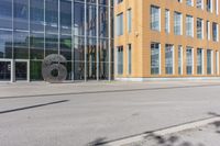A view of a modern office building in Barcelona's business district. The high-rise structure has a sleek facade and is surrounded by the vibrant city life. The road surface and asphalt create a dynamic urban design.