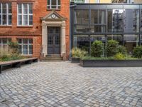 Urban Berlin courtyard with modern architecture and brick walls. The bustling city life is evident in the business district, showcasing office buildings and warehouses. A blend of historic cobblestone streets and contemporary design in Europe.