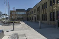 A modern architectural marvel in the heart of Toronto's business district. The brownstone building stands tall amidst the concrete jungle. Clear skies illuminate the urban design, casting shadows on the curbs and public spaces below.