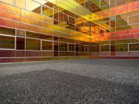 A modern office building in the business district of Holland, Netherlands. The multicolored facade creates a vibrant pattern, while the symmetrical design exudes a sense of symmetry. The open space in front of the building features gravel and dirt surfaces, adding a touch of natural element.