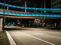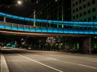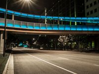 This image captures the urban landscape of a city in California, USA at night. The illuminated walkway leads to an elevated walkway over an empty street, with cars passing by. The clear night sky provides a beautiful backdrop for the city lights and the architecture of the office buildings. The infrastructure and urban design are showcased through the presence of street lights and traffic lights, as well as the asphalt road surface and bridges. This photo represents the lively city life and business district in California at night.