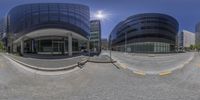 A modern high-rise building in a bustling urban business district. The building's sleek architecture and glass facade reflect the clear sky. The wide lens fish eye view captures the surrounding open spaces and street corners.