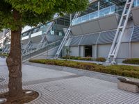 This image captures the bustling city life in Tokyo, Japan. The photo shows a modern office building surrounded by a paver surface in the heart of the business district. The urban design of Tokyo is evident in the sleek architecture and the busy streets filled with people. This image represents a typical day in the vibrant city, where business and urban life converge.