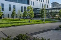 A modern high-rise office building in Toronto's business district. Trees and vegetation surround the building, creating a green oasis in the urban jungle. Glass windows showcase the bustling cityscape in the foreground.