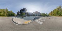 Contemporary architecture in Toronto's business district. The street corner features a small circular lens image capturing the full view of the building. Clear sky and straight road add to the modern urban design.