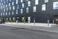 black car parked in front of black and grey building in front of parking spaces and building