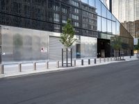 This is a view of a black and silver street scene in Berlin, Germany. The photo captures the modern architecture and urban design of the city's financial district. The glassy buildings and tall office buildings give the scene a futuristic feel. The road surface, asphalt, and metal walls add to the urban landscape. In the foreground, trees and vegetation provide a touch of nature amidst the bustling city. This image represents the vibrant city life and business atmosphere of Berlin's financial district.