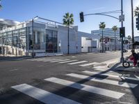 A bustling cityscape in Los Angeles, California. Modern architecture and office buildings line the streets of the business district. Clear skies illuminate the vibrant urban design, with shops and storefronts dotted along the roads.