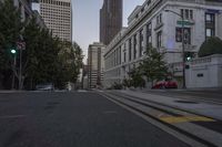 This stock photo showcases a busy city street in San Francisco during the break of day. The street leads down to the end of a hill surrounded by tall buildings. The modern architecture of the city blends seamlessly with the classic architecture, creating a captivating cityscape. The windows of the condominiums and high-rise buildings reflect the clear sky above. The bustling neighborhood comes alive with the motion blur of vehicles on the asphalt road. The infrastructure and urban design of this metropolitan area are truly remarkable, making it a vibrant and dynamic place to live and visit.