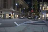 A vibrant night scene in Los Angeles, California. Classic architecture and boutique storefronts line the streets of downtown, illuminated by street lights. Pedestrians cross the busy intersection, bustling with the energy of the city.