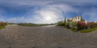A modern residential building in Los Angeles, California. The circular shape and white facade make it stand out against the clear sky. The stone driveway and vegetation add to the charm of this classic architecture.