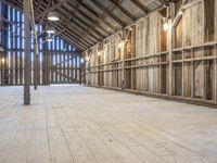 Elevated view of a barn interior in California. The rustic wooden beams, hardwood flooring, and high ceilings exude charm. The clear sky outside contrasts with the artificial light that fills the space.