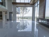 A modern villa in Los Angeles, California. The sleek architecture and open interior design feature floor-to-ceiling windows, allowing for plenty of natural light. The property offers a spacious living room and a clear view of the concrete landscape, with a clear sky above.