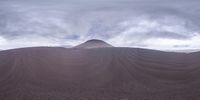 a barren hillside with hills covered in brown colored sand, surrounded by dark clouds and mountains