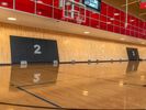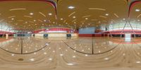 An aerial view of an empty basketball court in California. The high position captures the open space of the stadium. The straight down perspective showcases the hardwood floors and the lights shining from the ceiling.