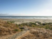 This image captures the coastal landscape of California, USA. It shows a gloomy day with a grey sky and fog rolling over the ocean and beach. The sandy shore extends along the water, contrasting with the asphalt road that runs alongside it. Open grassy spaces provide a natural environment for relaxation and leisure. In the distance, contrails streak across the clear sky, leaving traces of human activity in this serene coastal scene. This photo represents the unique blend of nature and urban elements that can be found in California's coastal regions.