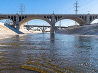A beautiful view of the Los Angeles aqueduct at dawn. The arch bridge and clear sky reflect in the calm waters of the river, creating a serene and picturesque scene. The suburban buildings and walls line the riverbank, blending nature with urban infrastructure.