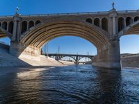This image captures a straight road in Los Angeles, California, with a clear sky overhead. The road leads to a bridge over the river, with concrete walls and a suburban area in the background. The water in the river reflects the daylight, creating a hard shadow under the bridge. This photo represents a typical day in the suburban area of Los Angeles, showcasing the urban infrastructure and natural elements like the river and the clear sky.
