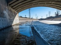 This image captures a scene in Los Angeles, California, USA. It features a suburban road and bridge with water flowing underneath in the river. The concrete street is lined with walls and shadowed by power lines and overhead wires. The clear sky above contrasts with the hard shadows cast by the bridge and surrounding infrastructure. This photo represents a typical day in the California suburb, showcasing the urban landscape and the presence of water in the river.