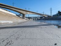 a narrow road with puddles on the ground, underneath an overpass and many electrical wires