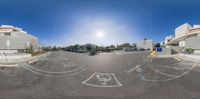 A modern architectural marvel in Los Angeles, California. This multi-purpose building stands tall in the city's business district. The upside-down view showcases the unique circular opening of the parking garage, surrounded by sleek design and clear skies.