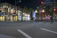A bustling city street in Los Angeles, California at night. The vibrant lights and classic architecture of the town create a metropolitan ambiance. People walk along the sidewalks as cars pass by on the busy road.