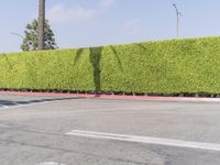 A sunny day in Los Angeles, California. The city streets lined with asphalt and residential buildings. Vibrant green vegetation, including trees, hedges, and shrubs, adorn the suburban landscape. A clear sky overhead illuminates the surface of the parking lots and walls.
