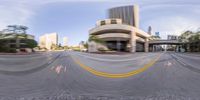 An empty street in downtown Los Angeles, California. The city's iconic skyline and skyscrapers tower above, while cars and buses navigate the asphalt roads. A bustling metropolitan area captured in a single frame.