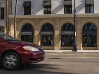 A sunny day in Los Angeles, California. A busy city street with cars and shops. Asphalt roads lined with buildings and storefronts. Urban landscape with vehicles and automotive design on display.