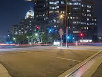 A nighttime view of Los Angeles, California. The modern architecture of office buildings illuminates the cityscape with artificial light. Streets and thoroughfares lined with street lights and traffic lights create a bustling business district.