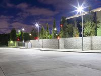 A night view of the modern architecture in Los Angeles, California. The cityscape is illuminated by street lights, creating a beautiful contrast with the dark sky. The concrete streets and open spaces blend seamlessly with the urban vegetation.