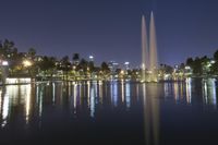 A captivating night view of Los Angeles, California. The city skyline is illuminated by artificial lights, reflecting on the water of a nearby lake. The urban metropolis merges seamlessly with open green spaces, creating a unique blend of city and nature.