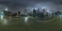 Nighttime view of downtown Los Angeles, California. The city's modern architecture is reflected in the wet streets, creating a stunning cityscape. Skyscrapers and street lights illuminate the urban metropolis.