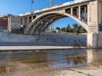 This photo captures a suburban scene in Los Angeles, California, USA. The image shows a concrete street with a bridge and an underpass. In the foreground, a man stands near the water as a plane approaches. The clear sky and residential buildings on the bridge create a serene atmosphere. This picture represents a typical day in Los Angeles, with its concrete infrastructure and river flowing peacefully in the background.