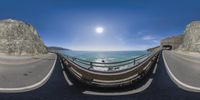 A high coastal bridge in California, with a straight road leading to the ocean. The bridge's low profile and clear sky backdrop create a stunning landscape. The bridge offers panoramic views of the ocean and the cliffs above. A must-visit spot on the Pacific Coast Highway.