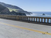 Scenic aerial view of the picturesque California Coastal Highway, also known as the Pacific Coast Highway, stretching along the beautiful coast of Big Sur. The image features the iconic Bixby Creek Bridge, a concrete bridge that spans over the mesmerizing turquoise waters of the Pacific Ocean. The road winds its way through the rugged mountain terrain, offering breathtaking vistas of the stunning landscape. The clear sky and the sound of crashing waves create a serene and tranquil atmosphere. The image showcases the well-maintained infrastructure with a guard rail and handrail, providing safety as you drive on this mesmerizing route.