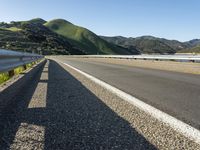 A motorcycle parked on a coastal highway in California, surrounded by lush green landscape and majestic mountains. The clear sky reflects on the calm ocean and river. The road surface, lined with Armco barriers, leads to a picturesque bridge over a lake.