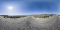 fisheye lens view of highway by the ocean with mountains and sun in background at the seaside