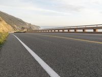This is an image of a road along the coastal cliffs of Big Sur, California, USA. The grey sky and fog create a moody atmosphere as a bike travels along the asphalt road. The road surface is lined with a guard rail and Armco barrier, providing safety along the highway. The low coastal line and rocky beach below add to the scenic nature of the landscape. This photo captures the beauty of the Pacific Coast Highway and showcases the unique infrastructure of the area.